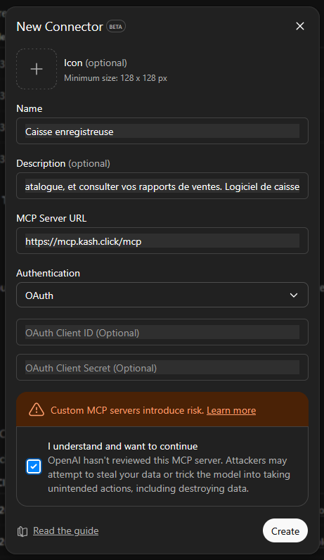 Dans ChatGPT, en utilisant un Espace de travail, accédez aux paramètres, Connecteurs, puis ajoutez un nouveau connecteur avec les paramètres suivants